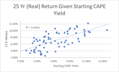 As you can see above, CAPE Yield is the best way to estimate the Real Return (return after inflation) for the next 25 years. The model with the best fit is the following:
